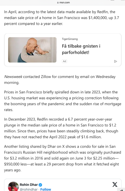 while anecdotes are interesting & are part of the story - it’s generally more useful to look at market trends. Since, beginning of 2024 - home prices are up in San Francisco 3.7% YTD according to the MSN story provided. No telling if this will be sustained or not. the big difference between San Francisco & Florida - SF has jobs & income to support high home prices. Florida does not - the Florida economy is driven by low-wage jobs in service & tourism. Florida’s real estate sector is based upon speculation. San Francisco economy is driven by global technology & finance - more billionaires per capita in SF than any where else. And it’s not just billionaires - the very high incomes of tech workers in SF supports high home prices in a very small city with a finite supply of housing. The problems in SF will eventually get fixed. And Florida will remain Florida, dependent on nonstop & unregulated population growth to sustain the real estate speculation, which has already peaked. both areas have a long history of boom & bust real estate cycles. no surprise SF is seeing a bust now.