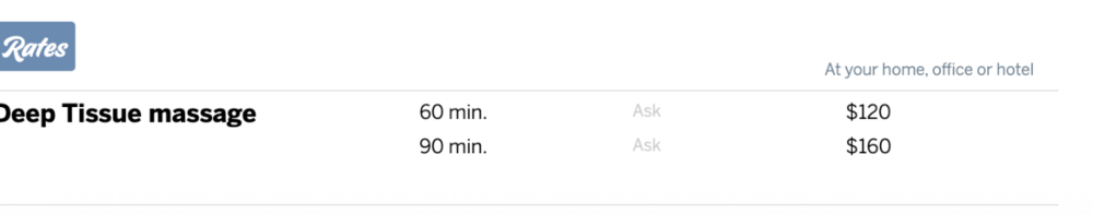 His rates. — no massage table Donation for the erotic massage is 200/60min 300/90min at my place or 250/60min 350/90min at yours (and will need to send me Uber/Lyft); we will both be naked or however you feel comfortable with and I use a combination of nuru/erotic technique during the session in which you are able to feel all parts of my body. -