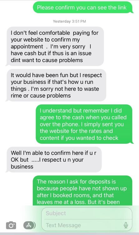 That’s the thing: I told him, go downstairs there’s an ATM there. He claims he already took the money out, but left it on the bed at home, and he didn’t have anymore to take out. I doubt his story added up. I think he came expecting to pull a fast one. Because he should have either come back in the morning or replied when I asked him for the cancellation fee payment. #1 yes #2 no #3 no Anyhow. I want to play a game. For each time someone argues against a deposit, I’m going to post an “anonymous” warning report from OTHER providers about a client who has actually contacted me. And include what happened when I asked for a deposit. If I run out of messages from guys who have multiple warnings, YOU WIN. (Hint, I have like a long list of them, so this game could be long 😆 Thankyou 💯 percent! I’ve come to the point where just having to realize the ones who can’t part with a deposit, are operating on control and fear and it’s not somebody I want to deal with. Or they are just using us for attention and entertainment. Unfortunately it seems the vast majority of people who contact are operating in this mindset. This is really pushing me to limit my interactions with most and start charging a rate that’s going to get me thru the week. Whether that be $500 or $1,000 per appointment. I’m not making any profit charging $250-300 when 90 % of calls are bullshitters. I’ve talked about this before, and now it’s time to start making it happen. I’m not just someone who’s in between jobs or needs extra money on the side. This is my LIFE (not yelling at you, just in general). I don’t have time to be playing childish games with dudes anymore. I’m over 1,500 miles from my home base, and dealing with a bunch of fucking idiots day in/day out. It has to stop. Case in point: -