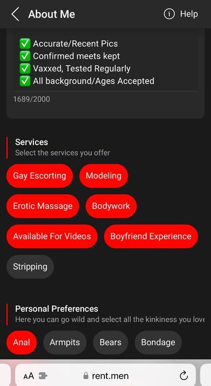 Just seeing this but: there’s a “hack” for that. Rent.Men will allow you to write a full page. In fact, when I edit my ad: I only use Rent.Men. Notice the character count of 2,000. I’ve used about 1,700 of them because, my ad needs to be able to full picture go over all important details, just in case they don’t trust clicking the link to go to my website. I guess that was part of the change over benefits from RentMen.eu. I also like the “map” feature on Rent.men because it shows more details like hotel location (even though I don’t always show my exact map location and when I do, it’s often at a hotel nearby that I’m not actually at just for privacy sake lol) versus the weird Rentmen.eu map which seems to only show government buildings/landmarks. They’re both Tom Tom so not sure how one is different. -