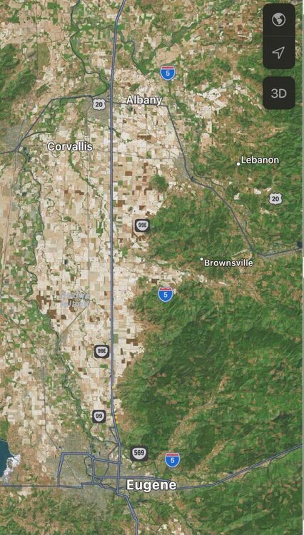 An example of 5G bizarreness: note I-5, 99 and 20 are showing to be scattered around the landscape and do not correlate to their actual positions in the real world topology~ Everything is anywhere from 3 to 7 miles off approx~ If you try to zoom in, the icons move all over the map, sometimes changing positions with each other completely~ Sometimes, the cities themselves change~