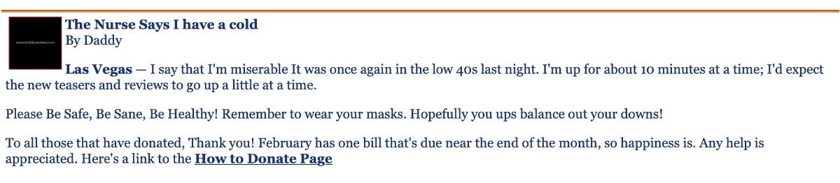 November 11 - March 26, 2021It was February 19, 2021 that we last heard from @Guy Fawkes. He had posted a simple message on the review site noting that he had a cold.