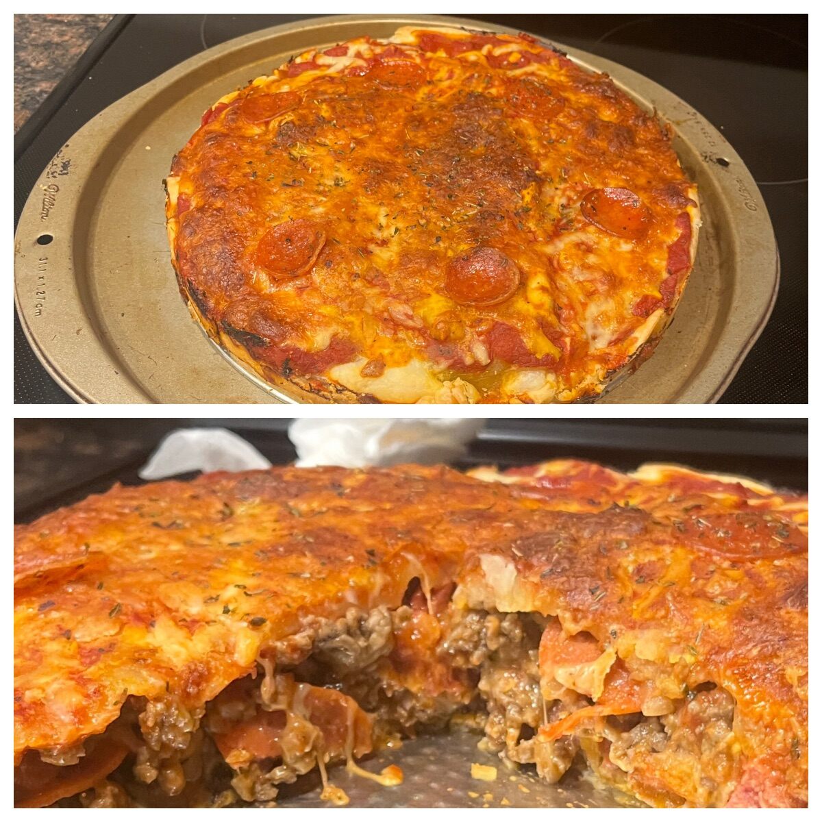 + Gar1eth Posted August 21 Posted August 21 I've made this a couple of times. And it's pretty dang good Deep Hamburger, Sausage & Pepperoni Pie ***(Note: "Construction is different between recipe and picture see below recipe)*** # Ingredients: → For the Crust 01 - 1 box ready-made pie crust (2 crusts) 02 - 3 tablespoons butter, melted 03 - ½ teaspoon garlic powder (for brushing crust) → For the Filling 04 - ½ pound ground beef 05 - ½ pound ground Italian sausage (Or smoked sausage and dice it) 06 - 1 to 1-1/2 cup pepperoni slices, divided into 3 portions 07 - 2 cups mozzarella cheese, shredded, divided 08 - 1 cup cheddar or provolone cheese, shredded 09 - 1½ cups pizza sauce or marinara 10 - 1 teaspoon Italian seasoning 11 - ½ teaspoon garlic powder 12 - (Experiment) 1 teaspoon salt over ground beef mixture or season as you brown it with 1/2 tsp kosher salt. 13 - ½ teaspoon red pepper flakes (optional) Consider green olives (or black) 1/2 cup sautéed onions, and 1/2 cup bell peppers, 1/2 cup mushrooms # Instructions: 01 - In a large skillet over medium-high heat, brown the ground beef and Italian sausage together, breaking it up with a wooden spoon as it cooks. Continue cooking until no pink remains, about 5-7 minutes. Drain off any excess fat and set the meat mixture aside to cool slightly. 02 - Preheat your oven to 425°F (220°C). Allow adequate time for the oven toreach temperature while you assemble the pie. 03 - Unroll one of the pie crusts and carefully press it into a deep-dish pie pan (at least 2 inches deep), allowing the excess to hang over the edges. If using a standard pie dish, make sure the crust goes all the way up the sides and slightly over the edge. 03.5 Blind Bake Crust at 425 F for 8 minutes 04 - Sprinkle 1 cup of the shredded mozzarella cheese evenly over the bottom crust. This first layer of cheese helps create a barrier between the crust and the wet ingredients, which helps prevent a soggy bottom. 05 - Spread the browned meat mixture evenly over the cheese layer. Arrange about ¾ cup of the pepperoni slices over the meat layer, reserving some for the top layer. 06 - Pour the pizza sauce or marinara evenly over the meat and pepperoni. 07- Sprinkle with Italian seasoning, garlic powder, and red pepper flakes (if using) to evenly distribute the spices. 08 - Top with the remaining 1 cup of mozzarella cheese and all of the cheddar or provolone cheese. 09- Arrange the remaining pepperoni slices on top of the cheese for an extra flavor boost. 10 - Unroll the second pie crust and place it over the filling. Trim any excess dough, leaving about ½ inch overhang. Fold the overhang under the bottom crust edge and press together to seal. Crimp or flute the edge decoratively. Cut several small slits in the top crust to allow steam to escape during baking. 11 - In a small bowl, combine the melted butter with the remaining ½ teaspoon garlic powder. Using a pastry brush, generously brush this mixture over the entire top crust and edges. 12 - Place the pie on a baking sheet (to catch any potential drips) and bake in the preheated oven for 20-25 minutes, or until the crust is golden brown and the filling is hot and bubbly. If the crust edges begin to brown too quickly, cover them with foil or a pie shield. 13 - Remove from the oven and let the pie rest for at least 5 minutes before slicing. This resting time allows the filling to set slightly, making it easier to serve neat slices. Cut into wedges and serve hot. # Notes: *****Picture Does Not Follow Recipe. Combining The Recipe And The Picture: 1. Bottom Pie Crust 2. #1 cheese layer- 1 cup mozzarella 3. 1/2 of meat and pepperoni and any veggies 4. 3/4 to 1 cup of marinara sauce 4. #2 cheese layer -1 cup of pizza cheese mix (mixed cheddar and whatever 5. Remaining ground meat, veggies and 2nd pepperoni 6. Remaining marinara sauce 6. Top crust -- 7. Brush crust with butter/garlic mixture 8. (Optional) Last cheese and 3rd pepperoni on top of crust. OTHER NOTES 01 - For an extra crispy bottom crust, consider blind baking the bottom crust for 8 minutes at 425 F before adding fillings. 02 - Feel free to customize with your favorite pizza toppings like mushrooms, olives, bell peppers, or onions. 03 - Leftovers can be stored in the refrigerator for up to 3 days and reheated in a 350°F oven until warmed through. 04 - For a shortcut version, you can use pre-cooked ground beef or Italian sausage